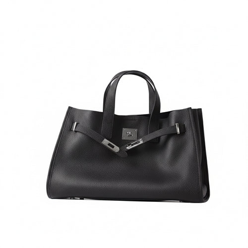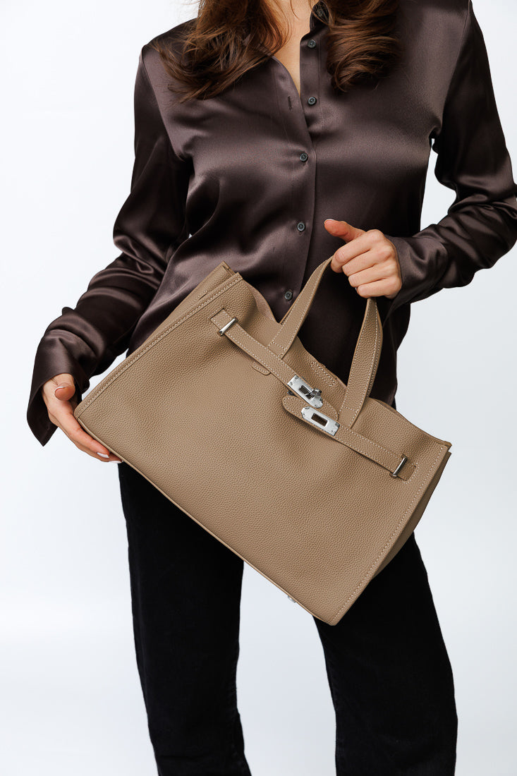 This leather tote features a spacious and practical design with hand-measured dimensions for accuracy. The bag measures 37 cm in width, 24 cm in height, and 15 cm in depth, offering ample room for everyday essentials while maintaining a structured, elegant silhouette.