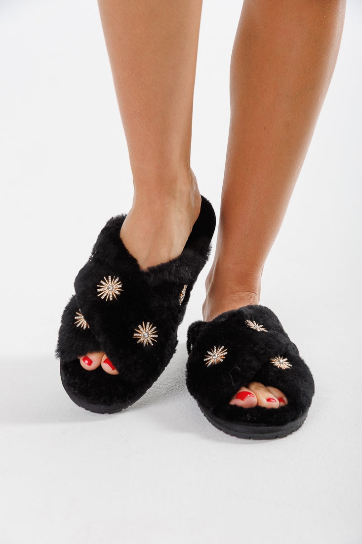 Sheep fur slippers accented with crystal