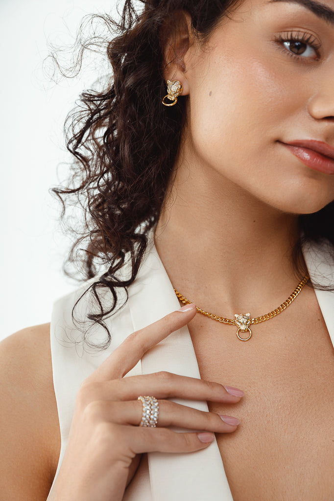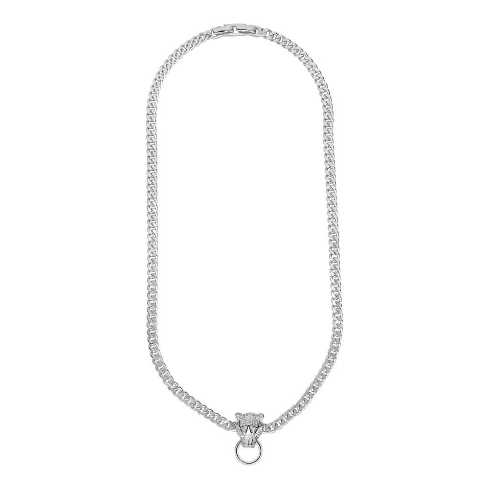 Experience the luxurious beauty of the PANTHER GOURMETTE NECKLACE with its gold plated design, sparkling cubic zirconium detailing, and striking emerald green panther eyes. Each link is meticulously crafted for a 16 inch necklace that exudes high-quality fashion and irresistible charm. Elevate your style and make a statement with this stunning piece of jewelry.