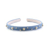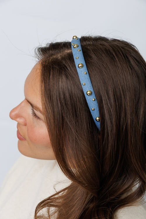 Elevate your hair game with this chic denim hairband, adorned with gleaming gold ball studs that add instant edge and sparkle to any look. Perfect for securing your style while making a bold fashion statement.