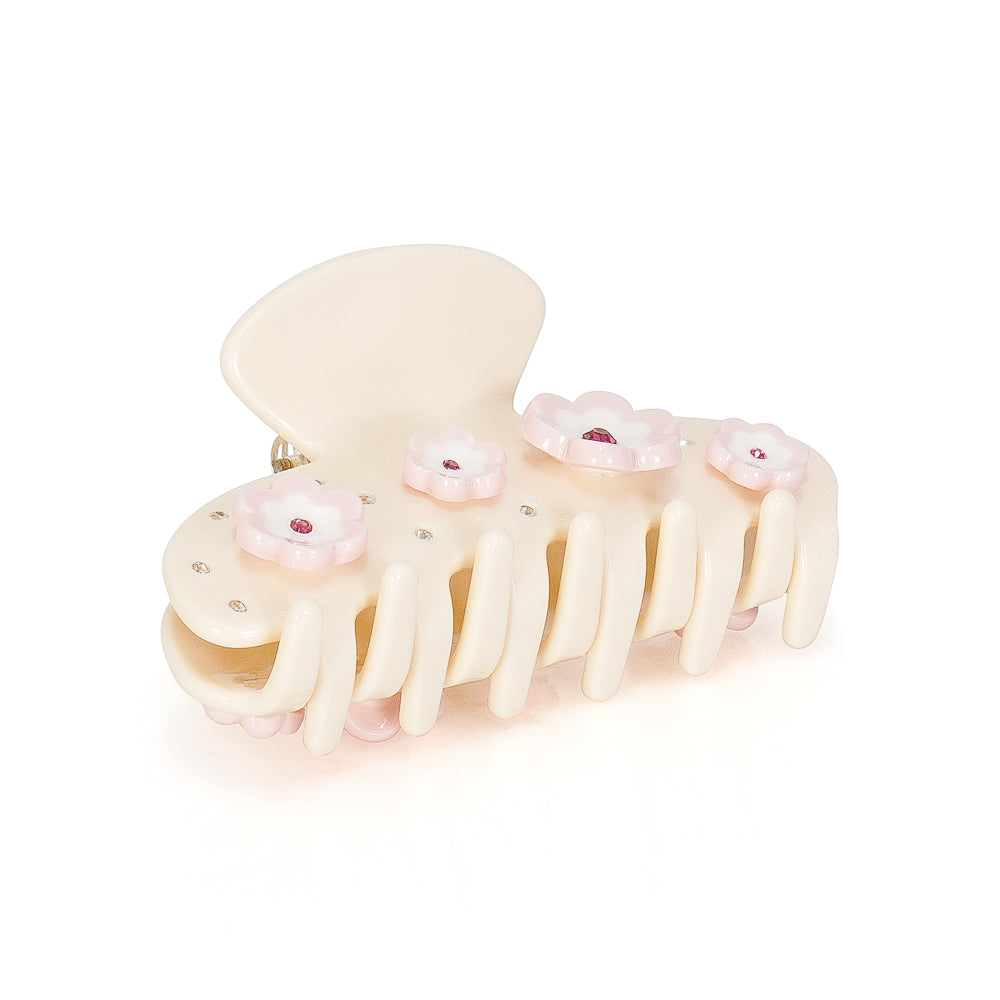 The BLOOM JAW CLIP features delicate flower details with sparkling cubic zirconium accents and measures 8 cm in size. Made with acetate materials, this jaw clip is both stylish and functional.